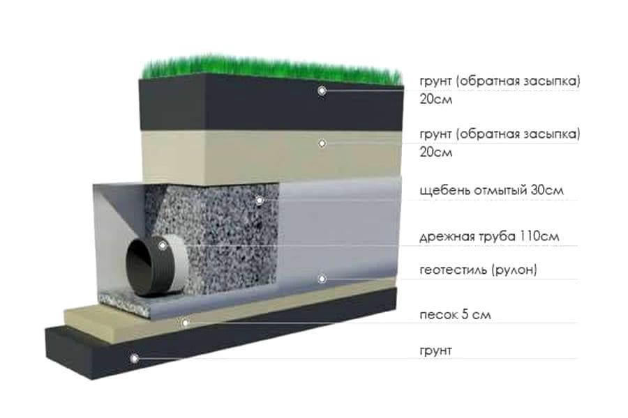 Глубинный дренаж - геотекстиль полотно плотностью не менее 200 г/м., Дренажная труба с перфорацией в гетекстиле D 110 мм.